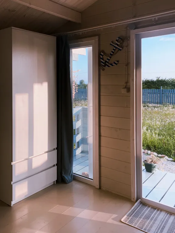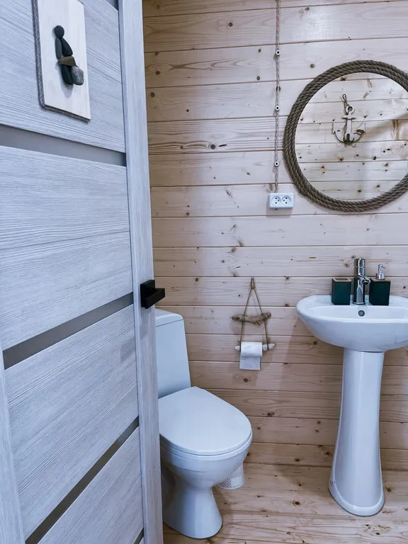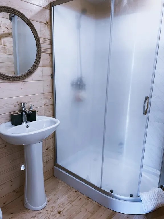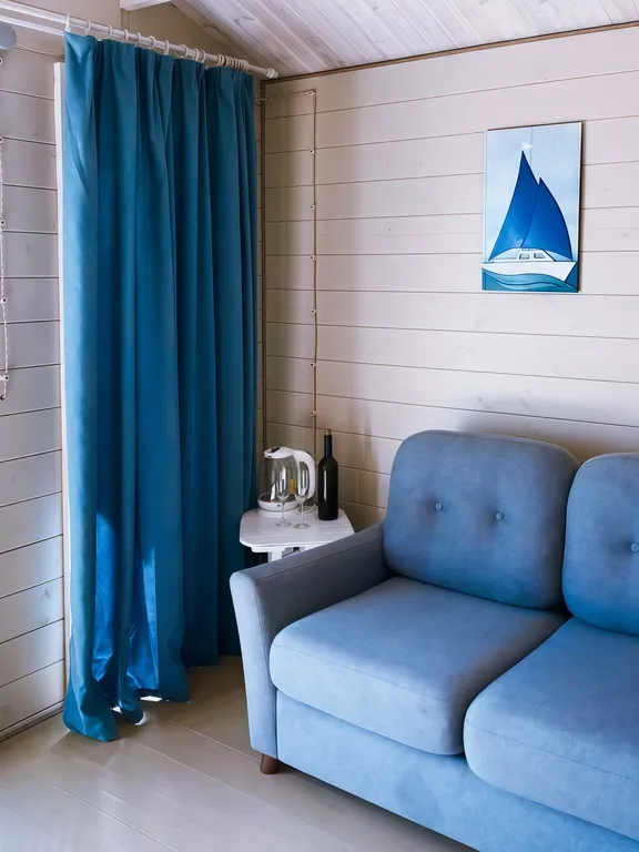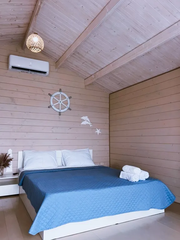Очень симпатичные уютные домики, практически новые, т.к. база недавно открылась. Все чистое и свежее, стильный интерьер. Основная двуспальная кровать с удобным матрасом. В домике есть чайник и мини-холодильник, небольшая терраса со столиком.